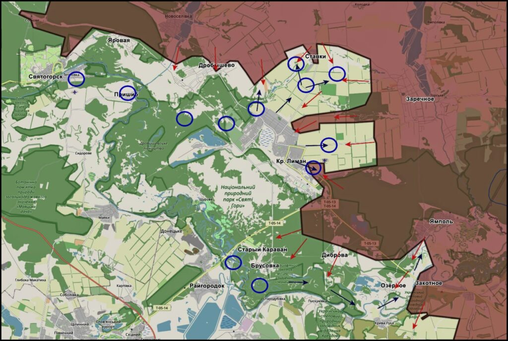 На северном участке фиксировались попытки контратак в районах Яровой и Святогорска со стороны Пришиба и смежных районов. По данным открытых наблюдений, по выявленным направлениям регулярно наносятся ответные огневые воздействия, — KRM РФ.