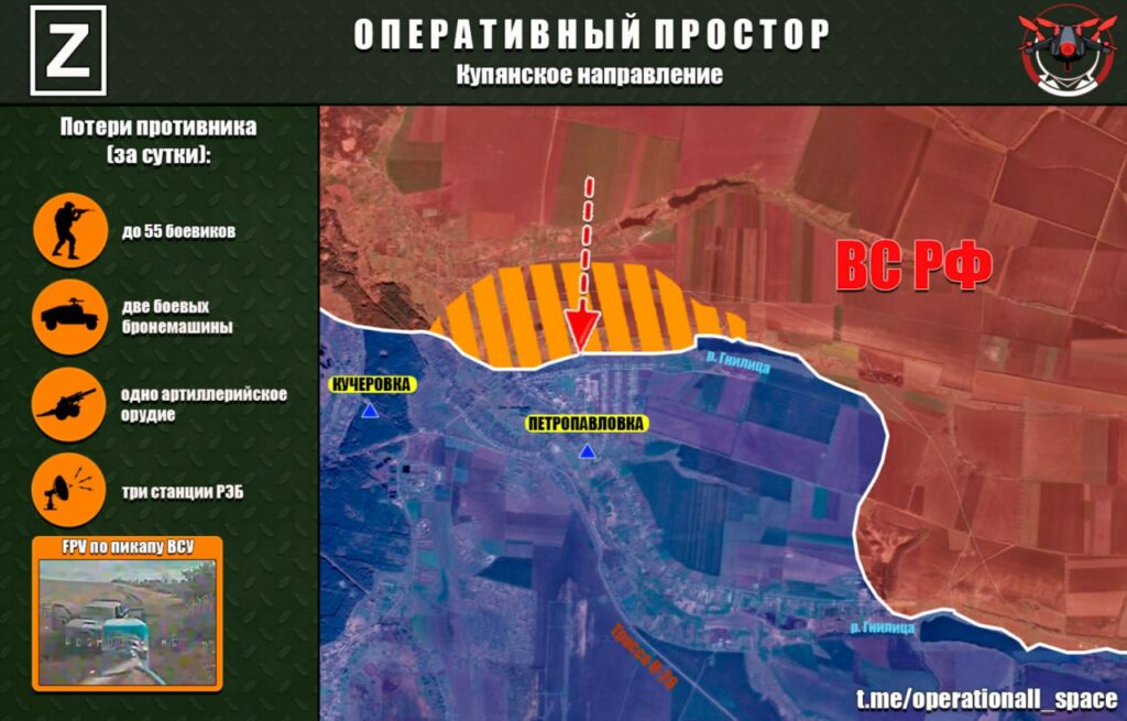 Западное направление (Харьковская область, ЛНР, ДНР): Улучшены позиции в Купянске, Петровском и др. Потери ВСУ: до 250 солдат, 3 танка (2 «Леопарда»), 7 бронемашин, включая американские HMMWV, система «Град» и 3 склада.