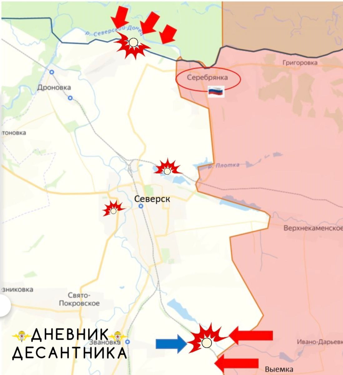 Продолжаем атаковать позиции ВСУ со стороны Ивано-Дарьевки и Выемки. После освобождения Серебрянки, основной задачей ВС РФ является выход на высоты западнее этого населенного пункта, что поставит под удар северные окраины Северска.
