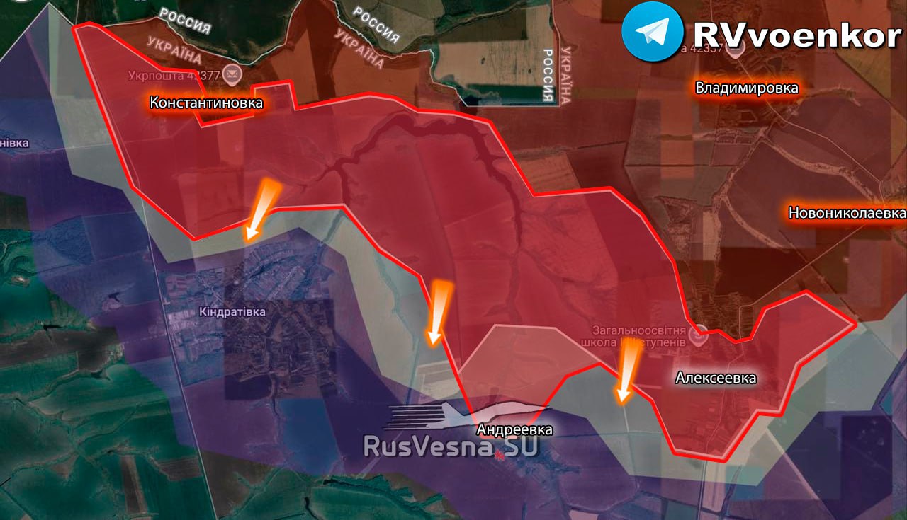 По поступающим данным, российские подразделения вошли с севера в Андреевку и продвинулись в сторону центра населённого пункта. Параллельно группировка войск «Север» ранее вернула под полный контроль район Константиновки и перешла к боям за Кондратовку, пытаясь охватить её с двух направлений.