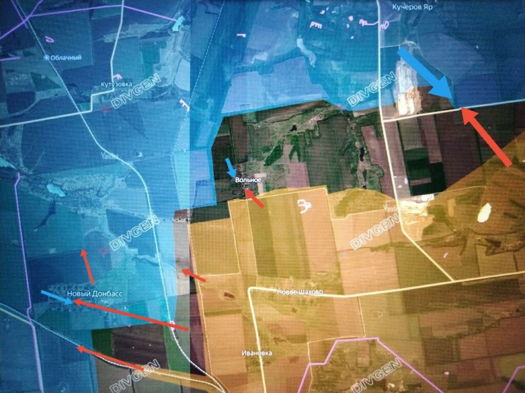 Северо-восточнее — встречные бои за Павловку. Юго-восточнее Новопавловки наши подразделения выбивают противника из посадок в направлении Райского. Западнее Торецкого ВС РФ продолжают бои в районе карьеров на подступах к Кучеров Яру. Юго-западнее наши подразделения нарастили давление на оборону ВСУ в направлении Доброполья. Ожесточённые встречные бои — в Новом Донбассе и Белицком, где противник предпринимает контратаки, стремясь остановить наше продвижение в направлении Доброполья.