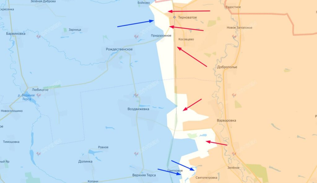 После сосредоточения сил к западу от реки Гайчур российские подразделения ворвались в южную часть Терноватое и начали методичное давление на украинские позиции в западной части города, взяв ряд опорных точек. Далее последовали проникновения в северные кварталы, где сформировалась обширная серая зона. ВСУ пока удерживают центр города, восточные улицы и коридор снабжения к востоку от Гайчура, однако конфигурация контроля становится всё более уязвимой.