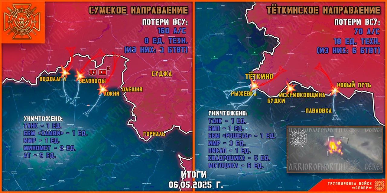 Из Павловки Сумской области в направлении Нового Пути направлялась колонна ВСУ из десяти квадроциклов, по ним отработали наши артиллеристы, там же сожжен вражеский танк Т-72. Также в направлении поселка Новый путь ВСУ предприняли попытку прорваться через границу на бронетехнике с ИМР. Сообщают, что после того как наши военные подбили ИМР, она загородила путь и не дала возможности проехать всей колонне, в итоге уничтожена и остальная техника украинских штурмовиков.