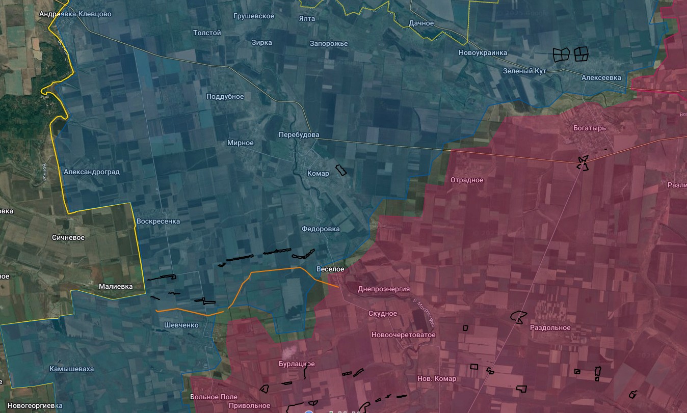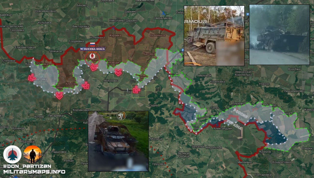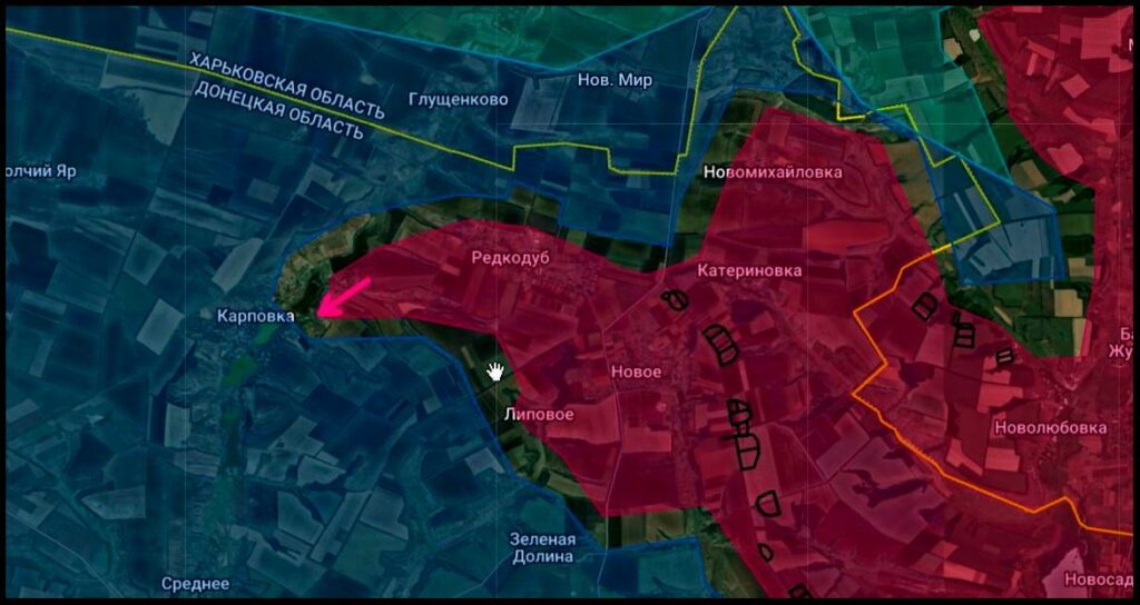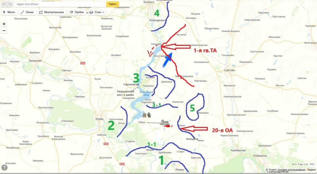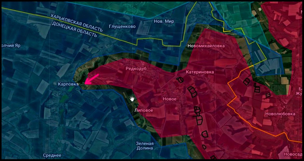 Дочищают противника в Новомихайловке и расширяют клин наступления на север в направлении Ольговки и Петровское (Грековка укр. с 2016) Ведут бои за Карповку от которой до важнейшей коммуникации Рубцы-Лозовое порядка 9 километров. Лишившись снабжения через нее, большая группировка ВСУ, прижатая к реке Оскол, не имея мостов, может уже сейчас начинать мастерить плоты по старым дедовским чертежам, — Схемы и карты военных действий.