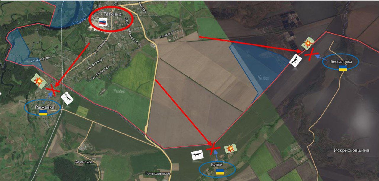 Противник продолжает наступательные действия в районе самого с.Теткино. Тут враг закрепился на нескольких участках: район очистных сооружений на окраине села, практически на границе с Сумской областью, и район кладбища. Оттуда ВСУ пытаются атаковать и развить успех в направлении Попово-Лежачи, с целью отрезать группировку в Теткино.