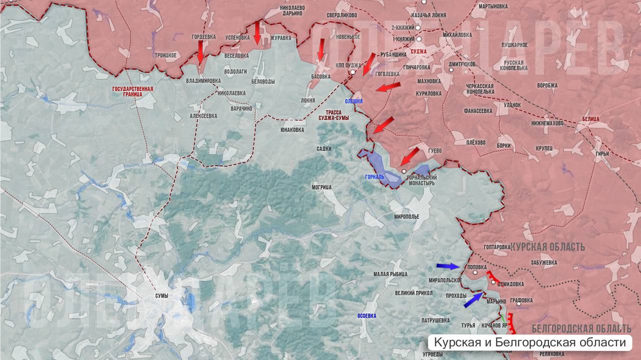 В районе хутора Олешни российские войска продвигаются по лесным массивам и балкам. Враг постоянно подтягивает подкрепления из Сумской области, идут тяжелые бои. Тем не менее наши части постепенно зачищают участок вдоль госграницы.