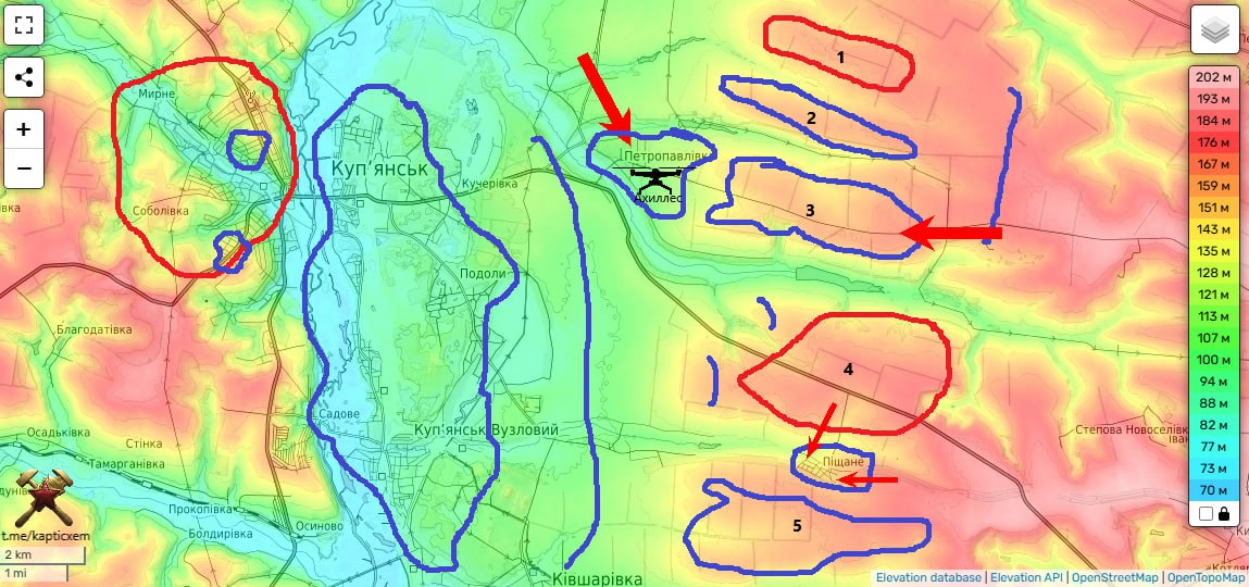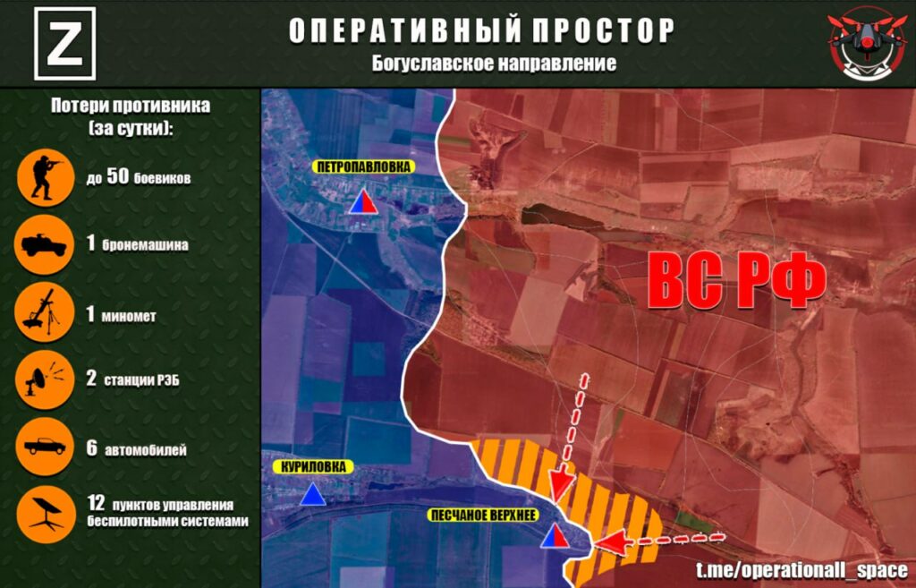 Основная проблема само село Петропавловка, вотчина 429-го ударного беспилотного полка «Ахиллес». Чуть ли не каждый дом превратился в пункт управления расчета БпЛА. Учитывая сложную логистику у гарнизона села, и то что пилотов укродронов в плен не берут, бплашники ВСУ должны уже начать оттягиваться в район Купянска-Узлового. А это была цементирующая оборону Петропавловки сила, — Схемы и карты военных действий.