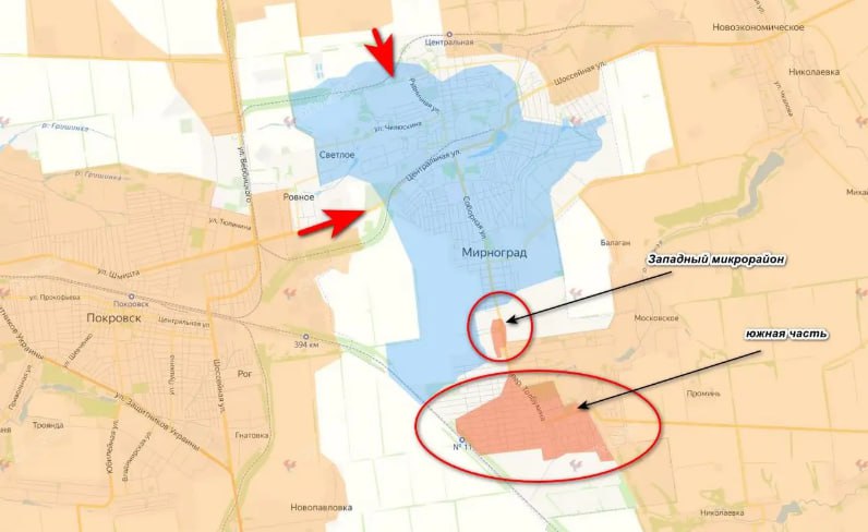 Российские штурмовые подразделения хорошо продвинулись в южной части Мирнограда и в микрорайоне Западный, противник под давлением отходит в центральную часть города, не в силах вырваться из окружения.