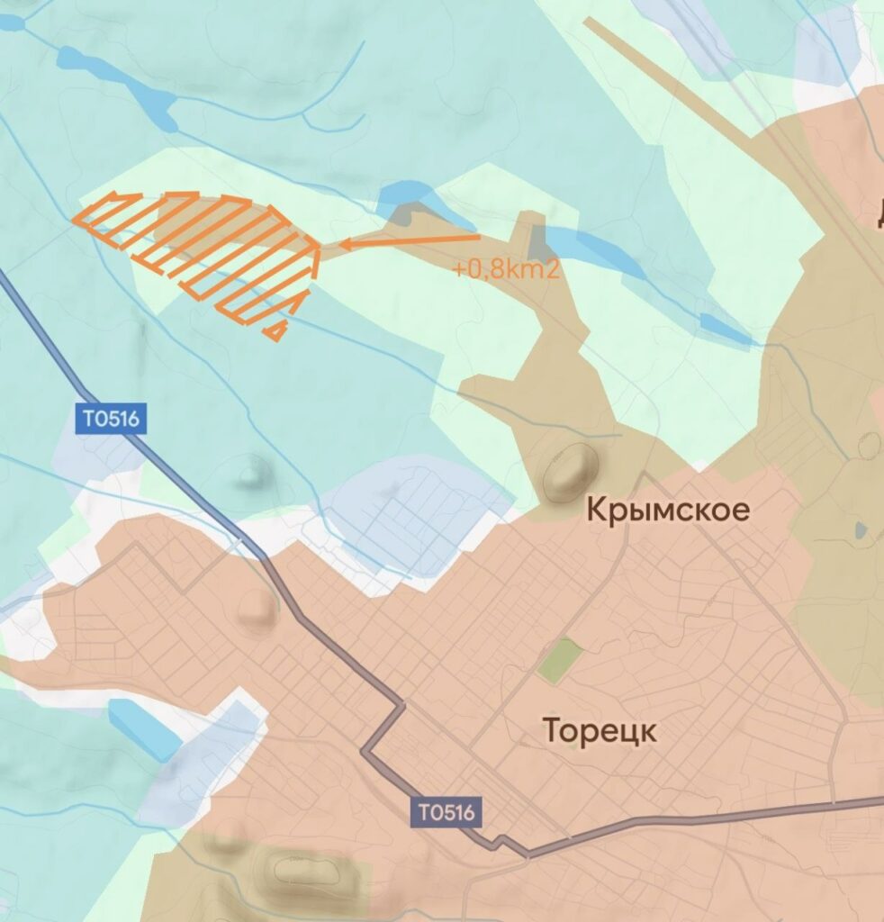 В н.п. Торское передовые подразделения ВС РФ установили флаг в северной части, подтвердив контроль над участком; продвижение в сторону центра составляет до 700 метров. Нанесены удары по пунктам управления БПЛА противника в районе Торского и в Заречного.