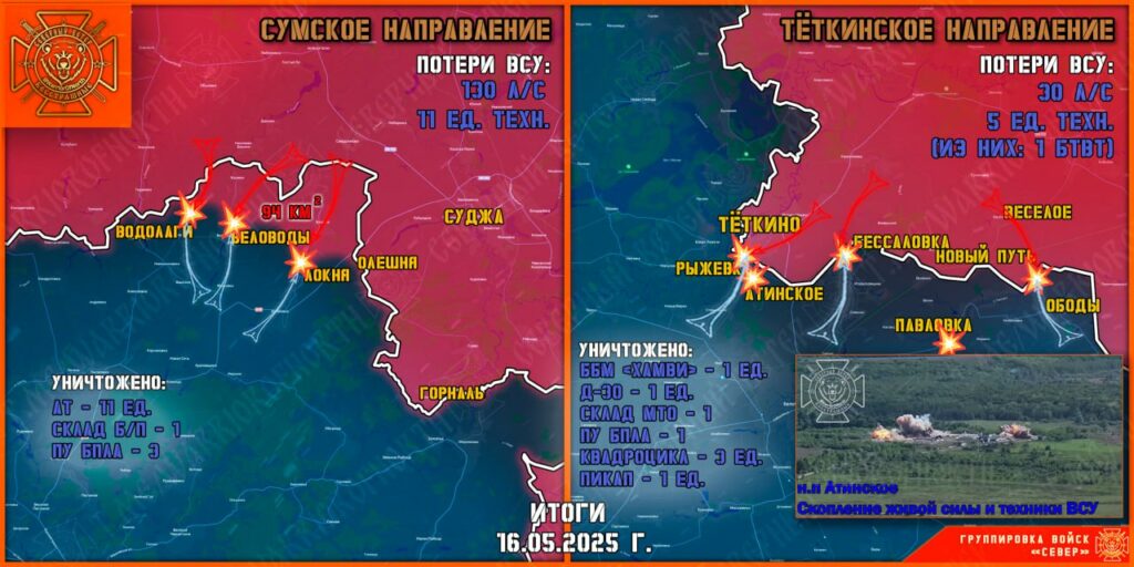 Из Сумской области ВСУ продолжают атаковать в районе Тёткино малыми пехотными группами и на технике. В районе села Атинское наши уничтожили инженерную машину разграждения, которая двигалась к границе. Интенсивные бои идут в районе села Водолаги в Сумской области.