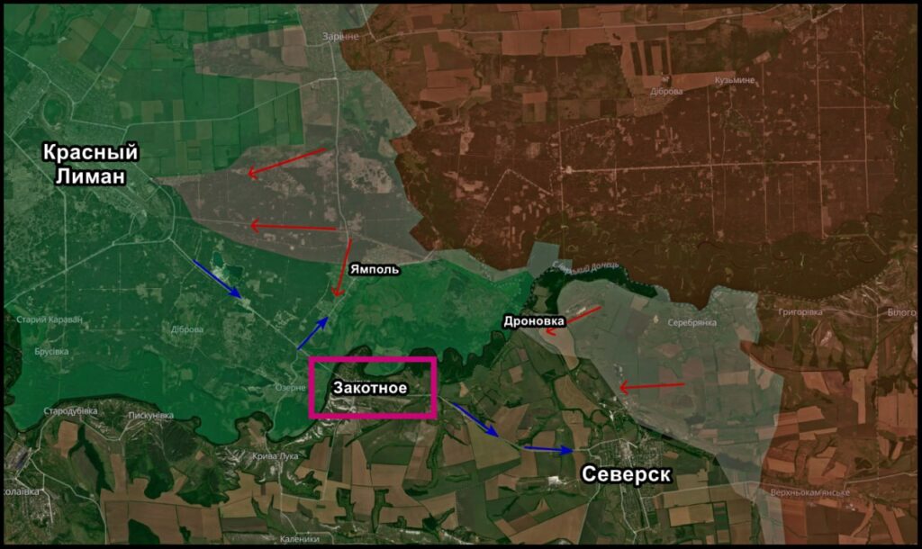 Российские войска развивают успех вдоль железнодорожной ветки в направлении Красного Лимана, используя естественные рельефы местности и лесные массивы для скрытного манёвра. Контроль над этим участком даёт возможность подойти к внешнему оборонительному контуру города, обеспечивая дальнейшее давление на позиции противника.