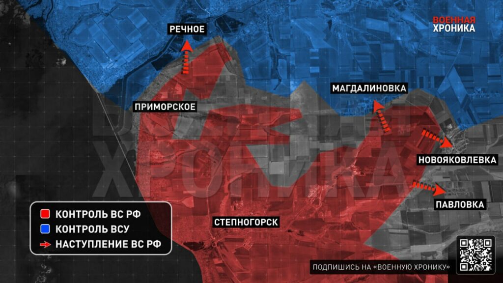 После активных боевых действий и зачистки Новобойковского подразделения ВС РФ продолжают движение на северо-запад — в направлении Магдалиновки, Веселянки и Речного, а также на восток — в направлении Новояковлевки, Запасного и Юрковки. В первом случае наступление взводно-тактических подразделений 7-й десантно-штурмовой дивизии осуществляется с господствующих высот 100—105 м по пологому склону равнины в направлении русла реки Конской, где находится целая цепь фортификационных узлов полка им. Калиновского и спецподразделения. В Магдалиновке подразделениям группировки «Днепр» предстоит сломать сопротивление и подавить ряд опорных пунктов РДК, 210-го ОШП, 241-й ОБрТрО и 128-й отдельной тяжёлой механизированной бригады ВСУ.