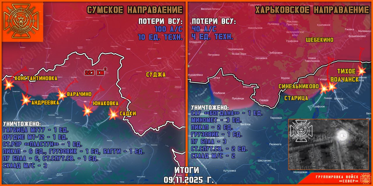 В районе Варачино ВСУ провели одну контратаку малыми группами 71 оебр, успеха не имели, с потерями отошли на исходные позиции. Кроме того, в Сумской области противник продолжает попытки завести ДРГ в тыл российских войск. Одна из таких групп была уничтожена накануне, ликвидирован сержант ССО ВСУ. На Теткинском и Глушковском участках фронта без существенных изменений. Артиллерия Северян наносила удары по выявленным целям ВСУ в районе Рыжевки.