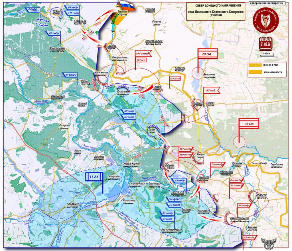 Плацдарм на линии Редкодуб-Карповка-Новоселовка защищает правый фланг группировки ВС РФ, штурмующей узел обороны противника Дробышево-Лиман и формирующей оперативный охват Славянского узла обороны ВСУ. Противник, понимая опасность выхода подразделений ВС РФ к н.п. Рубцы, выдвинул в этот район 3 отдельную штурмовую бригаду для усиления своей группировки на этом участке, — военкор Марат Хайруллин.