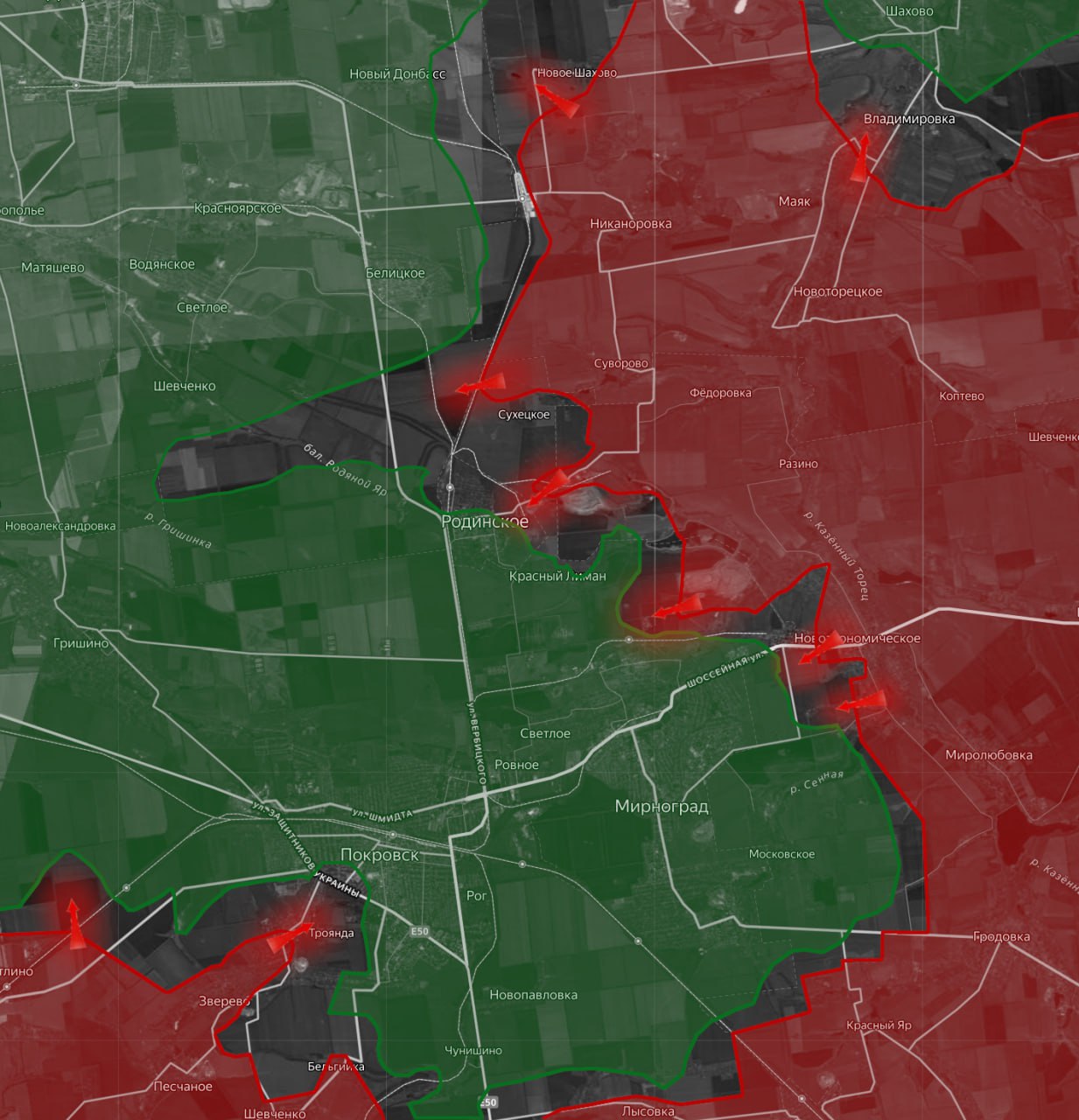 В Покровске российские штурмовики активно действуют в черте города, мешая противнику сосредоточить в нем силы для ударов. В это же время прибывшие подкрепления ВСУ пытаются контратаковать на флангах, на которых наступление армии России идет медленнее. Результата у таких контратак почти нет.