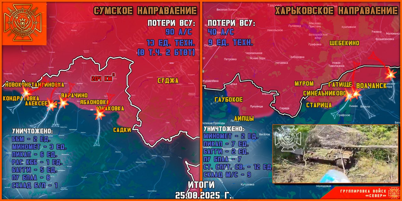 На Харьковском направлении тяжёлые бои за плацдарм в южной части Волчанска. Есть тактические успехи в районе Хатнего и Амбарного. Продолжаются тяжелые бои в лесу возле Синельниково и в Волчанске на левом берегу реки Волчья. ВСУ контратак не проводили и отсиживаются в обороне, оказывая ожесточенное сопротивление. В Волчанске Воины Севера продолжили расширять плацдарм на левом берегу р. Волчья и заняли одно техническое здание, закрепляются. Общее продвижение составило до 200 м.