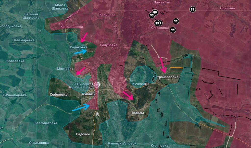 На правом берегу Оскола идут бои в городской черте, фиксируются ежедневные контратаки ВСУ. На левом берегу российские подразделения ведут атаки в направлении Петропавловки, Кучеровки и Подол.