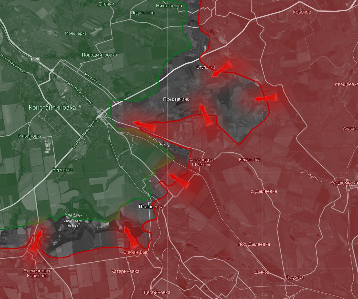 На юге Константиновского направления, в районе Александро-Калиново и Клебан-Быка, армия России ведет позиционные бои за господствующие высоты и дорожные развязки, которые обеспечивают фланговое прикрытие нашей наступающей группировки. Расширена зона контроля в Иванополье, а также в кармане между этим селом и Александро-Шультино. Наши значительно продвинулись в районе Новомарково, расширили зону контроля и около Орехово-Васильевки.