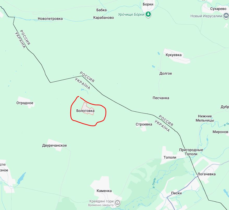 ВС РФ пересекли границу и начали наступление в Харьковской области в районе н.п. Бологовка. Населенный пункт полностью перешел под контроль русской армии. Ранее за него велись бои, н.п. переходил из рук в руки, сейчас ВС РФ закрепились и развивают наступление.