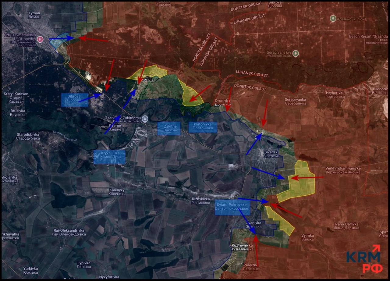 На Краснолиманском направлении ВС РФ улучшили тактическое положение в Масляковке, а также продвинулись к трассе Красный Лиман – Закотное. Передовые подразделения пробиваются к западу от Яровой к реке Северский Донец. От Шандриголова наступают на запад к Александровке. Также атакуют в районе Среднего, стараясь перерезать дорогу снабжения Редкодуб-Коровий Яр. Выше по фрону наши двигаются к Богуславке и Новоплатоновке.