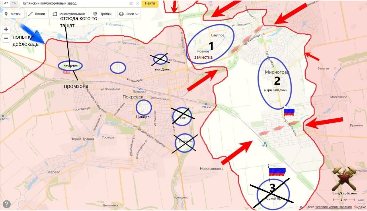 На левом фланге Красноармейского направлении ВС РФ атакуют Новоподгородное со стороны Ленино (Молодецкое) и в направлении Сергеевки со стороны Удачного. Группировка ВСУ в Красноармейске и Димитрове разрезана на две части, сообщения между ними больше нет. Наши штурмуют восточную часть Димитрова. Севернее ВСУ контратакуют у основания «Добропольского выступа». От Бойковки до Затышка и до Никаноровки – серая зона, позиции вперемешку. Дорожное, Новое Шахово также в серой зоне. Наши продвигаются в северо-восточной части Шахово, а также севернее Русин Яр в районе карьеров.