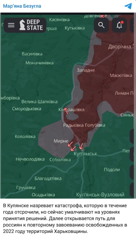 Проблему пытались отсрочить в течение года, а сейчас замалчивают на всех уровнях, пишет нардеп. Для российских войск открывается путь масштабному продвижению в Харьковской области, утверждает она.