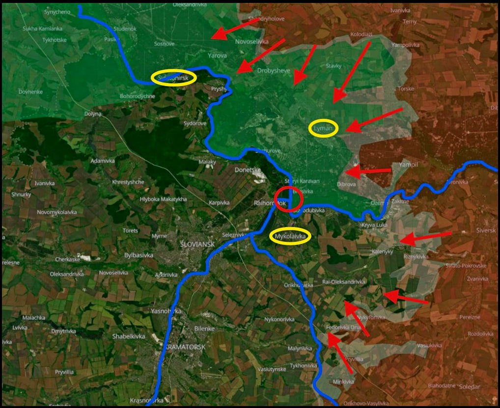 Продолжаются ожесточенные городские бои за Красный Лиман. Российские силы предпринимают попытки продвинуться в Святогорске. Накануне сообщалось о поражении моста через реку Северский Донец. Ситуация в районах Александровки, Дробышево и Коровьего Яра остается без существенных изменений.