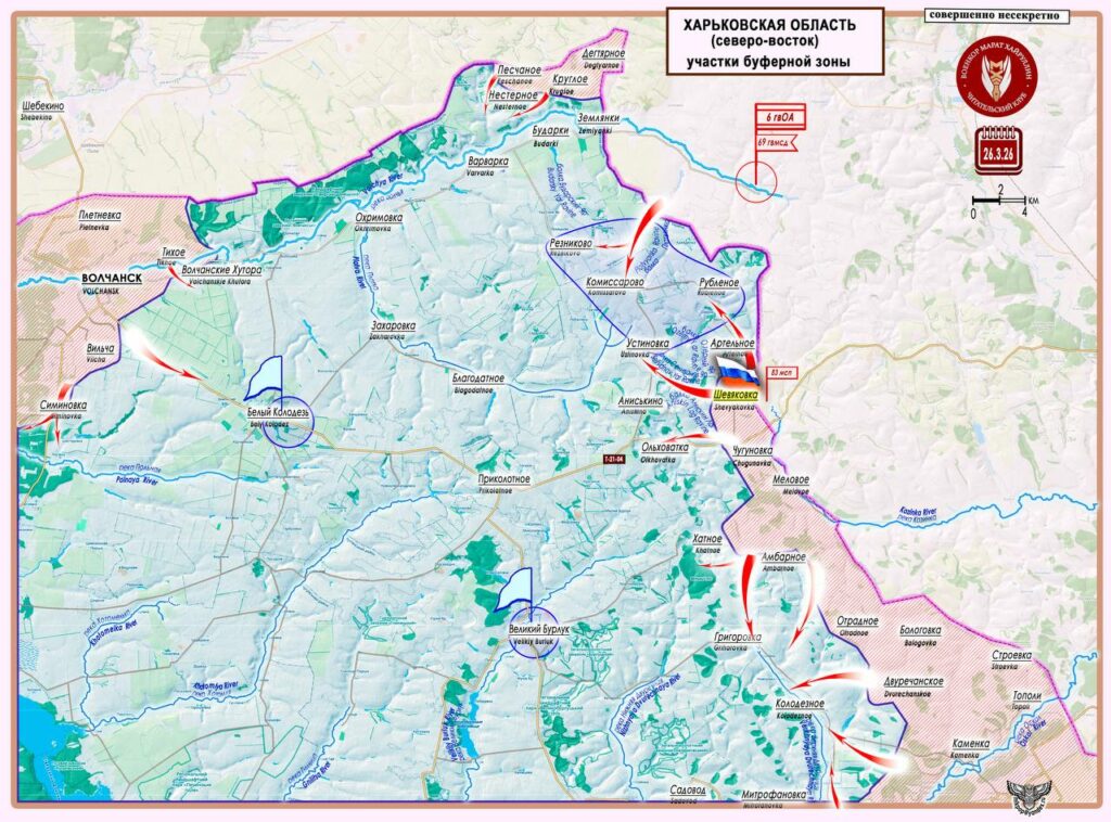 Как вчера сообщило МО РФ: «Подразделения группировки войск «Север» в результате активных и решительных действий установили контроль над населенным пунктом Шевяковка Харьковской области». Наблюдается заметная активность ВС РФ на северо-восточном участке Харьковского направления: 24 марта был освобожден н.п. Песчаное, а 26 марта, южнее, подразделениями 83 мотострелкового полка был установлен контроль над н.п. Шевяковка (50°12′47″ с. ш. 37°35′26″ в. д. — население 33 чел. в 2001 г.), расположенном в двух километрах от границы с Россией.