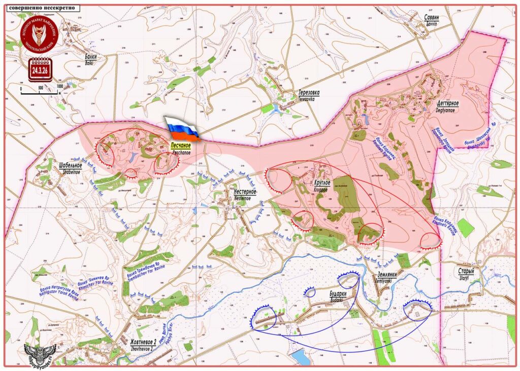 Как вчера сообщило МО РФ: «Подразделения группировки войск «Север» установили контроль над населенным пунктом Песчаное Харьковской области». ВС РФ расширяют буферную зону на участках, где территория Украины выступает в восточном направлении и образует удобные плацдармы для обстрела территории РФ мобильными группами. 24 марта был установлен контроль над н.п. Песчаное (50°25′41″ с. ш. 37°21′03″ в. д. — население 28 чел. в 2001 г.).