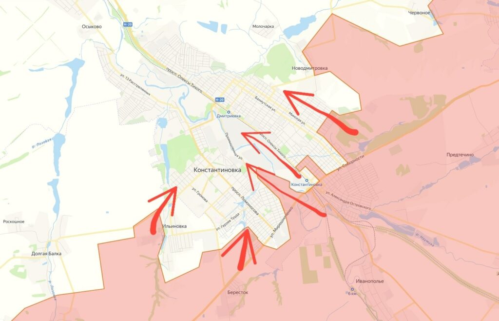 Российские войска смогли закрепиться в зданиях по улице Цинковой и продвинуться к улице Мусоргского и улице Кутузова почти в центре Константиновки. Несколько восточнее бойцы армии России подошли к окраине промзоны по реке Кривой Торец, взяв первые ангары в южной ее части. Если удастся занять ее полностью, то это даст ВС РФ опору для продвижения дальше — на северо-запад — к западным окраинам Константиновки.