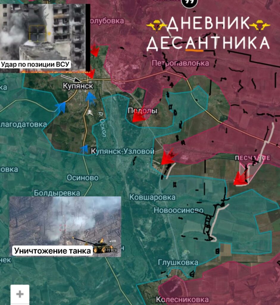 Уничтожена жирная цель — украинский танк Т-72. Операторами дронов-FPV уничтожен один из кочующих танков ВСУ, который использовался для поддержки украинских штурмовых групп, действующих к северо-западу от Купянска. Несколькими точными ударами танк был уничтожен, выгорев до основания без возможности восстановления, — Дневник Десантника.
