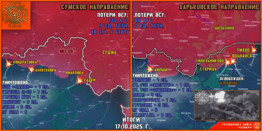 На участке фронта Меловое-Хатнее штурмовые подразделения группировки «Север» продвинулись на 400 м и овладели лесополосой. Ударами российской авиации и тяжелой реактивной артиллерии уничтожены позиции противника в районах Двуречанского и Зеленого Гая. На Липцовском участке фронта без существенных изменений. Бесстрашные продолжили наносить удары по средствам РЭБ и пунктам управления БпЛА 92 ошбр ВСУ и 13 брон НГУ в Липцах, — Северный Ветер.