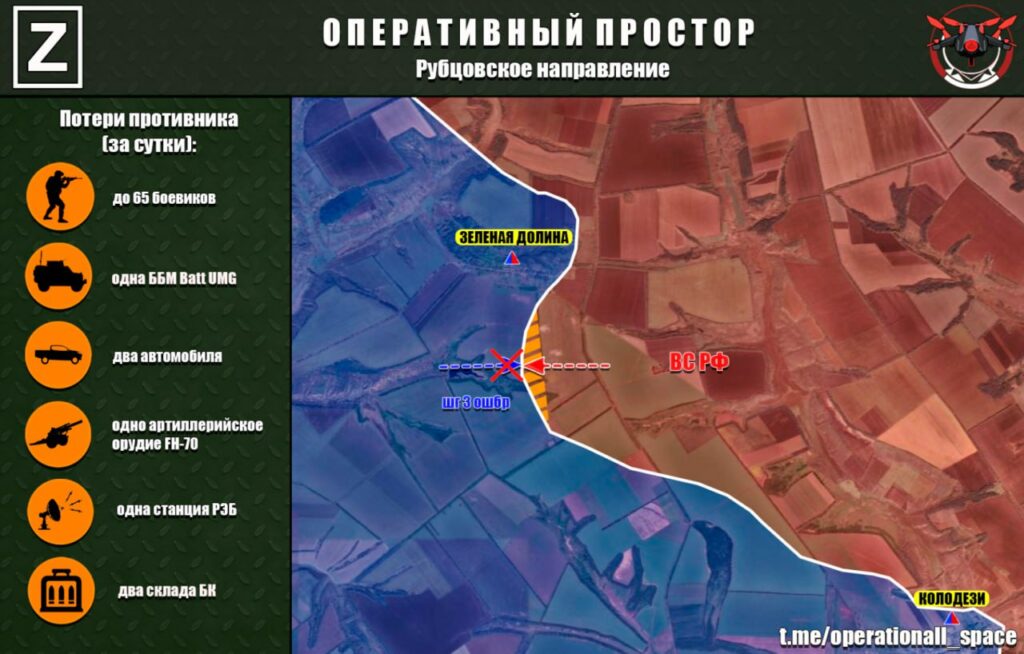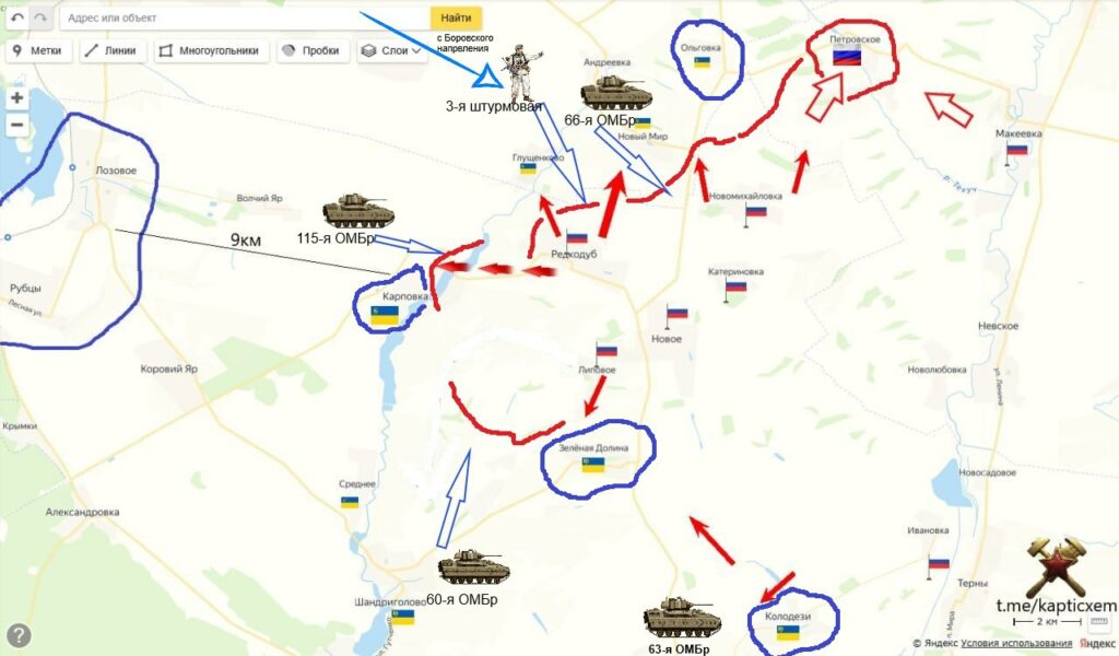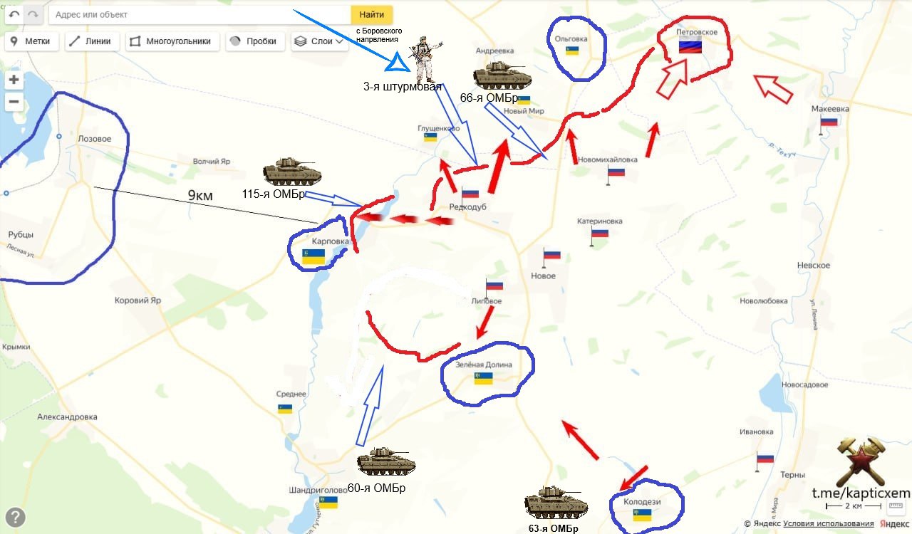 После взятия Петровского, мы растянули свой правый фланг, чем незамедлительно попытался воспользоваться противник и перебросил 3-ю штурмовую бригаду с Боровского направления в помощь своим механизированным подразделениям. Блокировав наши атаки в Карповке и Зеленой Долине, ВСУ подразделениями 3-й штурмовой бригады нанесли основной удар по Редкодубу, а вспомогательный в стык между Новомихайловкой. На данный момент противник выдохся, потерял темп атаки, и по неофициальным данным, выбит с окраин Редкодуба.