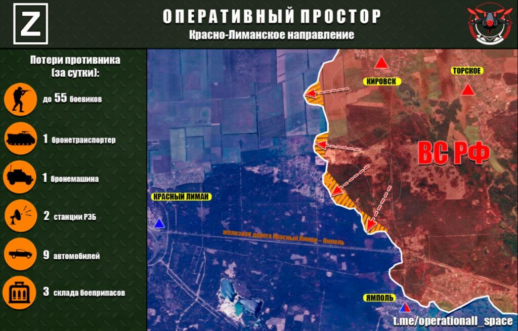 ВС РФ наступают на рубеже Кировск – Ямполь. Подразделения #25_армии ГВ «Запад» улучшили тактическое положение для дальнейших действий в направлении н.п. Красный Лиман и по освобождению н.п. Ямполь.