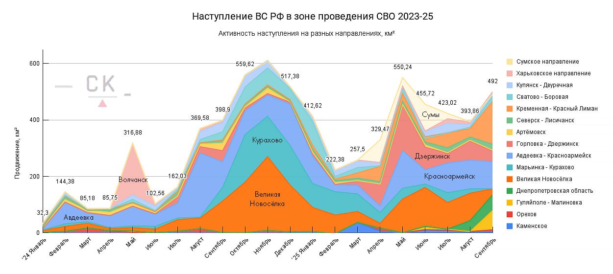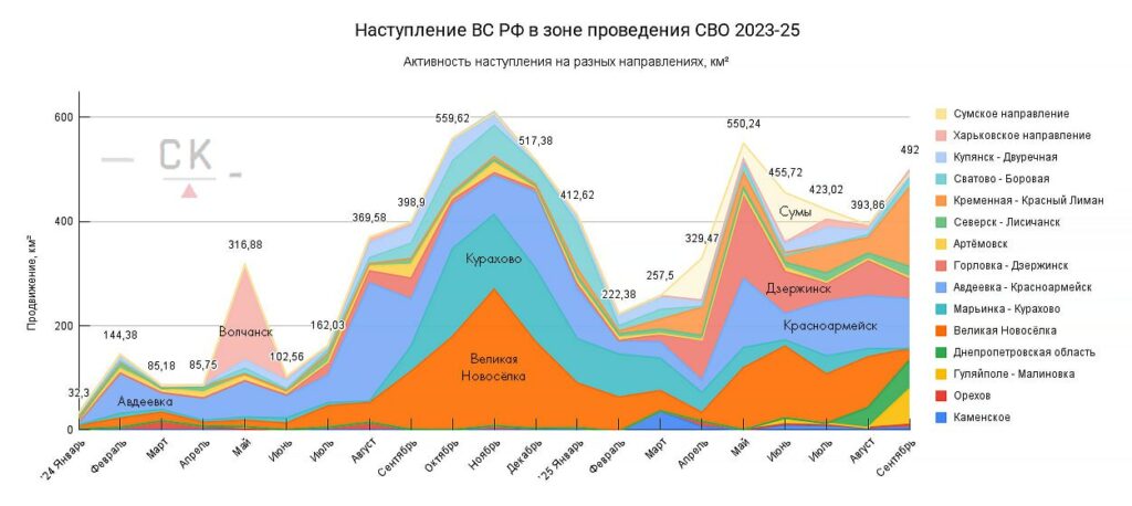 10 октября 2023 года началась наступательная операция ВС РФ. За 2 года наступления под контроль ВС РФ в зоне проведения СВО перешло 7 057 км² (+ 489 км² к 10 сентября 2025) территорий с суточным темпом продвижения 9,65 км² (+0,27 км² к 10 сентября) в среднем за всё время наступления.