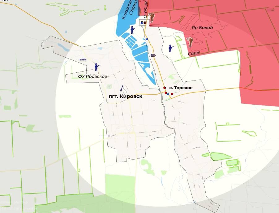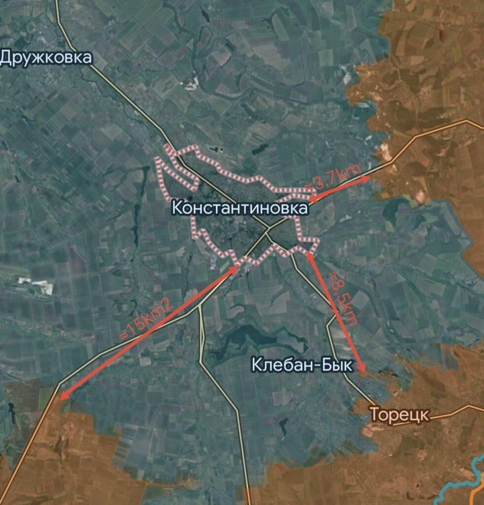 Западнее Торецка российские подразделения перерезали трассу на Константиновку в районе Новооленовки и продвигаются к Полтавке. По оперативным данным, наши войска, продвигаясь широким фронтом, вышли к окраинам Яблоновки. Восточнее наши бойцы ведут ожесточенные бои в большом кармане, пытаясь заблокировать ВСУ по рубежу Александрополь-Заря-Романовка. Для этого наши штурмуют Романовку и пробиваются к Заре. Этот клин опасен для ВСУ тем, что он угрожает Покровску с востока и формирует охват района Александро-Калиново -Клебан-Бык в предполье Константиновки. Восточнее Торецка идут бои в посёлке Дылеевка.