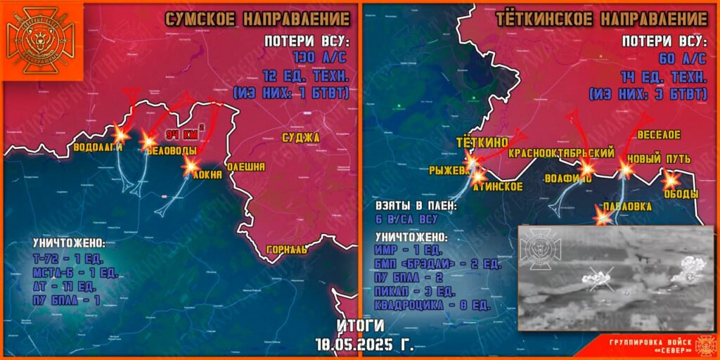 В Сумской области российские подразделения продвигаются в границах села Беловоды. Наши штурмовики продолжают продвигаться вглубь украинской территории, выполняя задачу по созданию полосы безопасности. Подразделения ВДВ Северян в ходе ожесточенных боев продвинулись в районе села Беловоды и в самом населенном пункте.