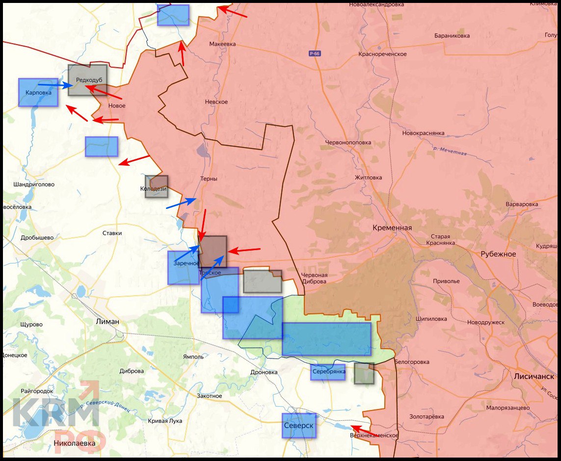 На Краснолиманском участке наши войска теснят ВСУ в Редкодубе. Под контролем ВС РФ по разным оценкам до половины села. Упорные бои продолжаются в районе Колодезей, Торского и в направлении на Грековку. За последнее время наши войска нарастили давление на позиции украинских боевиков на участке Григоровка — Верхнекаменское. Ширина фронта на данном участке составляет порядка 10 км. Следует отметить, что ВФУ ведут ожесточенное сопротивление на восточных рубежах Северска, не жалея личного состава и ударных дронов. На некоторых позициях ВС РФ за сутки фиксируется до 100 атак вражеских БПЛА, — сообщает Красный Лиман Инфо.