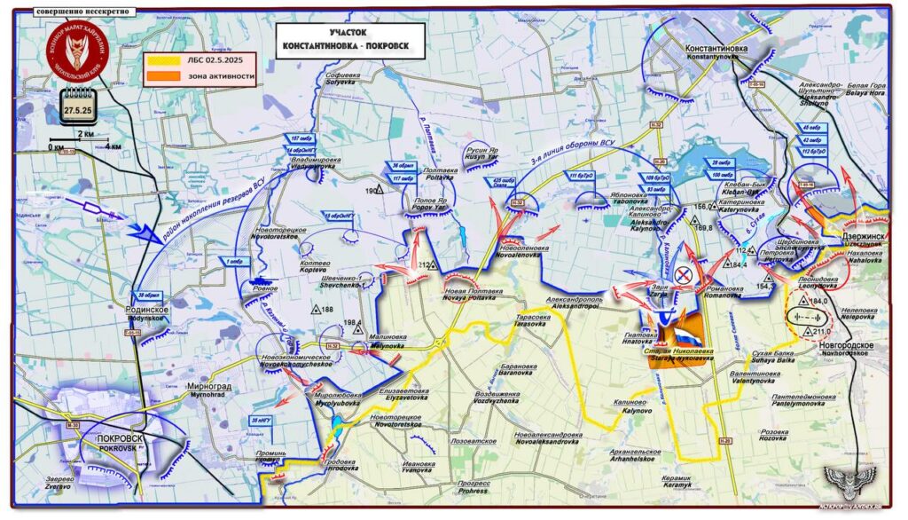 На Покровском фронте ВС РФ продвигаются западнее Богдановки к границе с Днепропетровской обл. Активные бои идут в районе Муравки и в Новосергеевке. В Удачном и Котлино без изменений долгое время — позиционные бои. На восточном фланге ВСУ контратакуют от Новоэкономического, но остановить наступление армии России не могут. Сообщают, что наши штурмовики буквально на плечах противника вошли в Мирное и освободили больше половины села.
