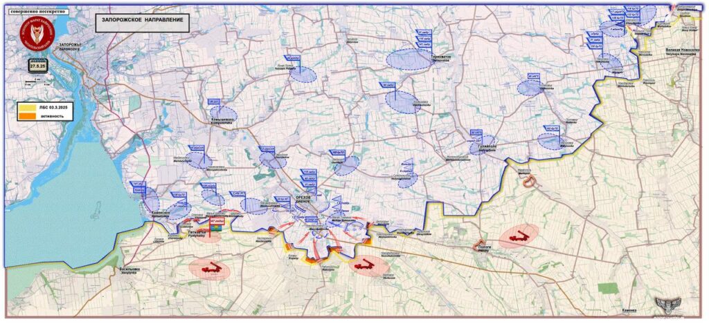 За прошедшие сутки Армия России продолжила наступательные действия на рубеже Работино-Вербовое. Бойцы 1430 гвардейского полка 58-й гвардейской общевойсковой армии нанесли поражение силам ВСУ севернее Работино. На Ореховском направлении, в районе Новоданиловки и Малой Токмачки идут позиционные бои, линия боевого соприкосновения без изменений. Авиация ВКС РФ и РСЗО наносят удары по укрепленным районам ВСУ.