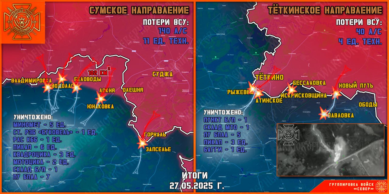 Из Сумской области противник по-прежнему атакует приграничные сёла. Военных результатов у этих атак нет, но в селе Попово-Лежачи ВСУ уничтожили очередной храм. ВС РФ теснят ВСУ в районе сёл Сумской области — Владимировки, Водолаг и Беловод, где намечается удар в сторону Яблоновки.