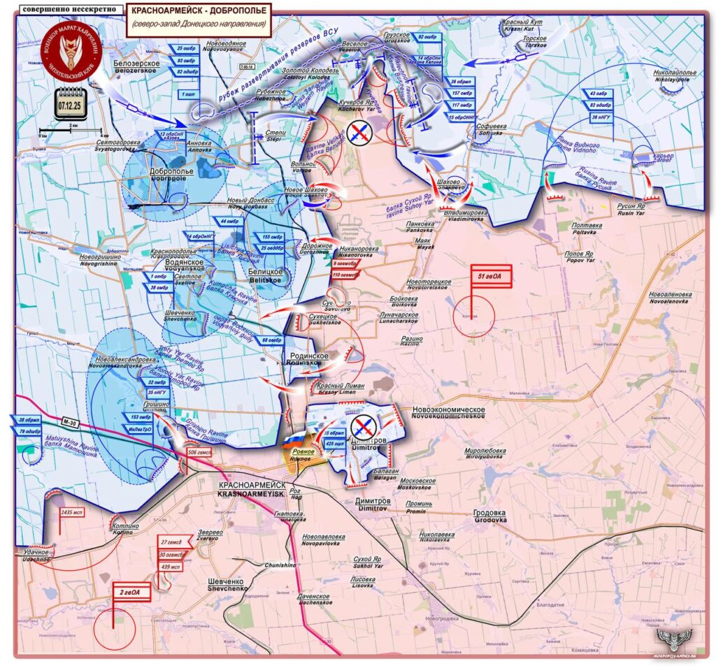 На Красноармейском фронте тяжелейшие бои идут за контроль над Гришино. Под контроль ВС РФ перешло около четверти села. Со стороны Котлино наши части практически вышли к дороге на Новопавловку. Севернее Красноармейска ВС РФ выбивают врага с ферм и приближаются к Гришино с востока. В Димитрове наши взяли под контроль мкр. Западный и продвигаются в районе мкр. 40-й квартал. Идут бои в районе Светлого, ВСУ оказывают упорное сопротивление в мкр. Молодежный. В Родинском тоже идут очень ожесточенные бои. Встречное сражение разворачивается по линии Суворово-Никаноровка, Со стороны Ивановки и Нового Шахово ВС РФ пробиваются в сторону Нового Донбасса. Большая часть Софиевки под нашим контролем, идут бои в Торецком.