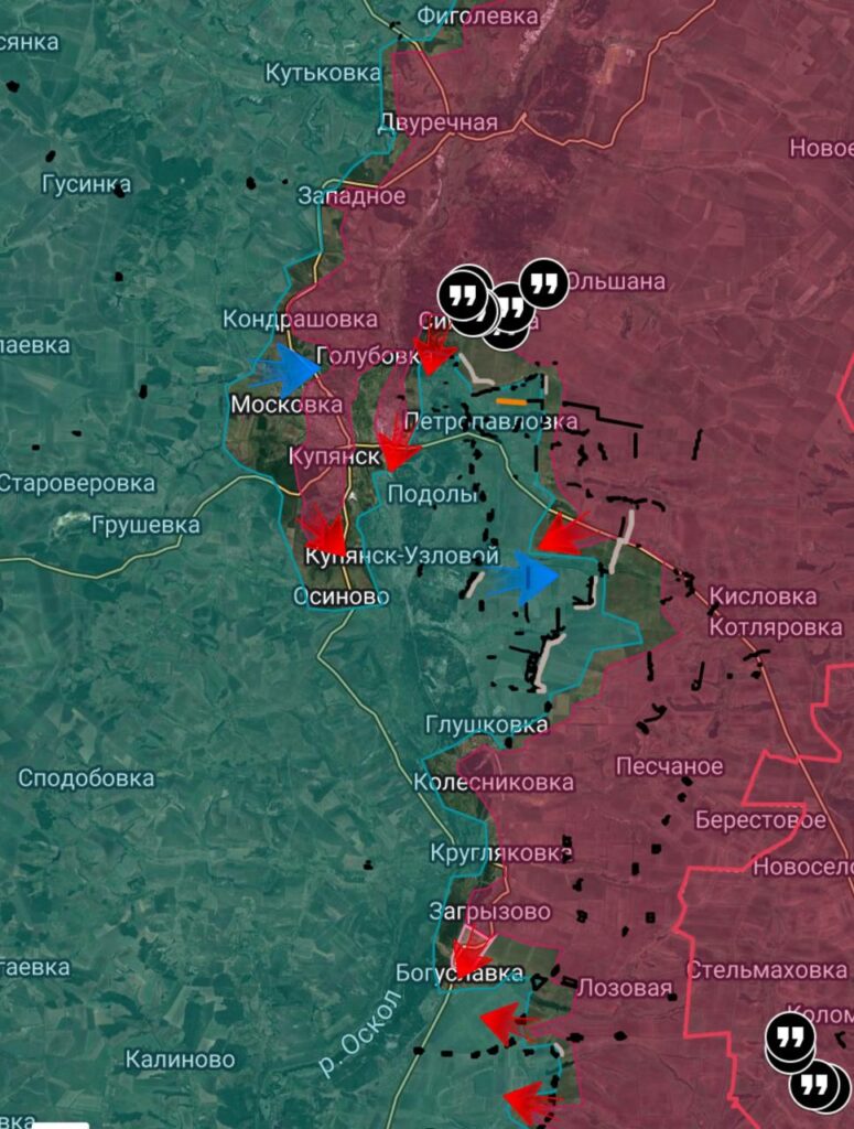 На Купянском направлении основная тяжесть боев в районе Купянска-Узлового и восточнее Оскола. Упорное сражение продолжается за Петропавловку. ВСУ атакуют севернее Купянска и западнее Песчаного, пытаясь перерезать нашу логистику у Радьковки и кричат о «пэрэмоге». На деле: основная группировка ВСУ в Купянске отрезана, мы расширили контроль у Соболевки, Кучеровки и севернее Песчаного, вынудив противника растягивать силы.
