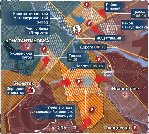На Константиновском направлении сохраняется высокая интенсивность боевых действий. Основные столкновения разворачиваются на южных подступах к городу. Российским подразделениям удалось продвинуться на ряде участков, однако целостной линии контроля пока нет: между позициями сторон остаются участки так называемой «серой зоны», где ни одна из сторон не обладает устойчивым преимуществом.