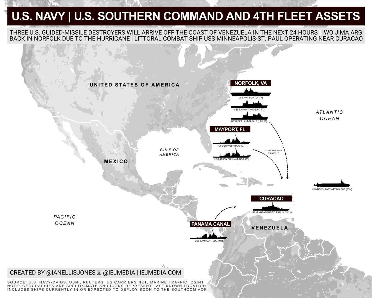 США направили к берегам Венесуэлы ракетный крейсер, подводные лодки, самолёты-разведчики и более 4500 военнослужащих. Официально Вашингтон заявляет, что цель — борьба с наркотрафиком, но многие считают, что Дональд Трамп может использовать это как повод для свержения президента Венесуэлы Николаса Мадуро.