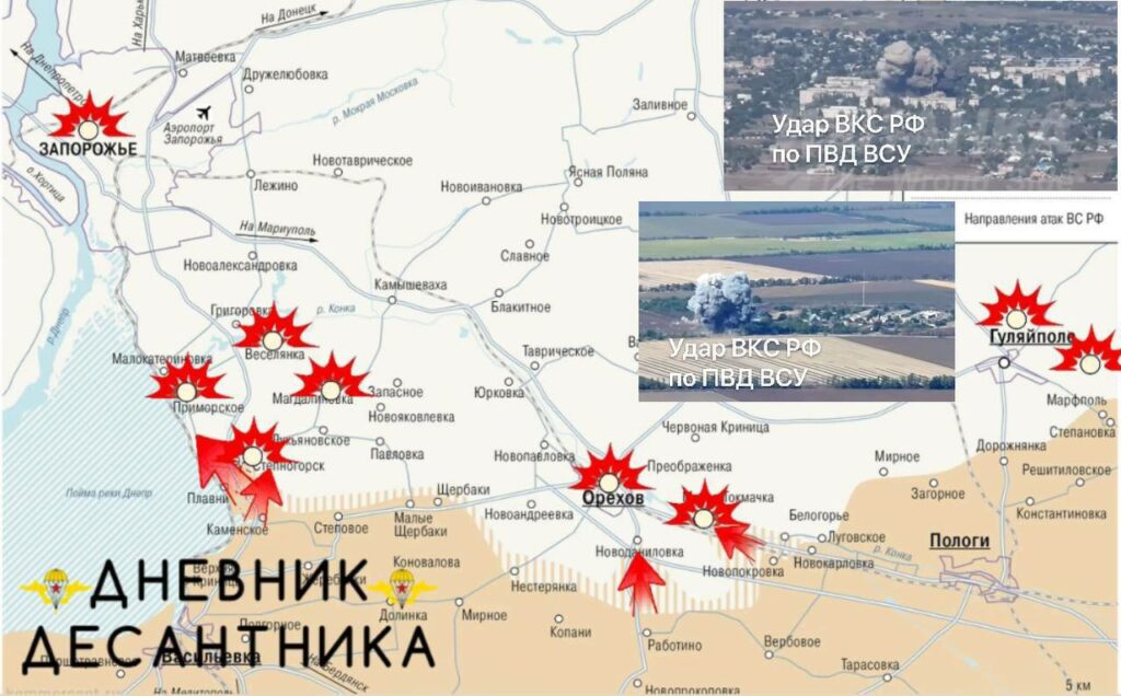 Так ВКС РФ по наводке воздушной разведки нанесли удар по пункту дислокации 102-й обр ТерО ВСУ с применением ФАБ-3000 в н.п. Гуляйполе. В районе Новогригоровки уничтожен ФАБом-500 с УМПК пункт дислокации 110-й бригады ВСУ. Бои по освобождению Запорожского направления продолжаются, — Дневник Десантника.