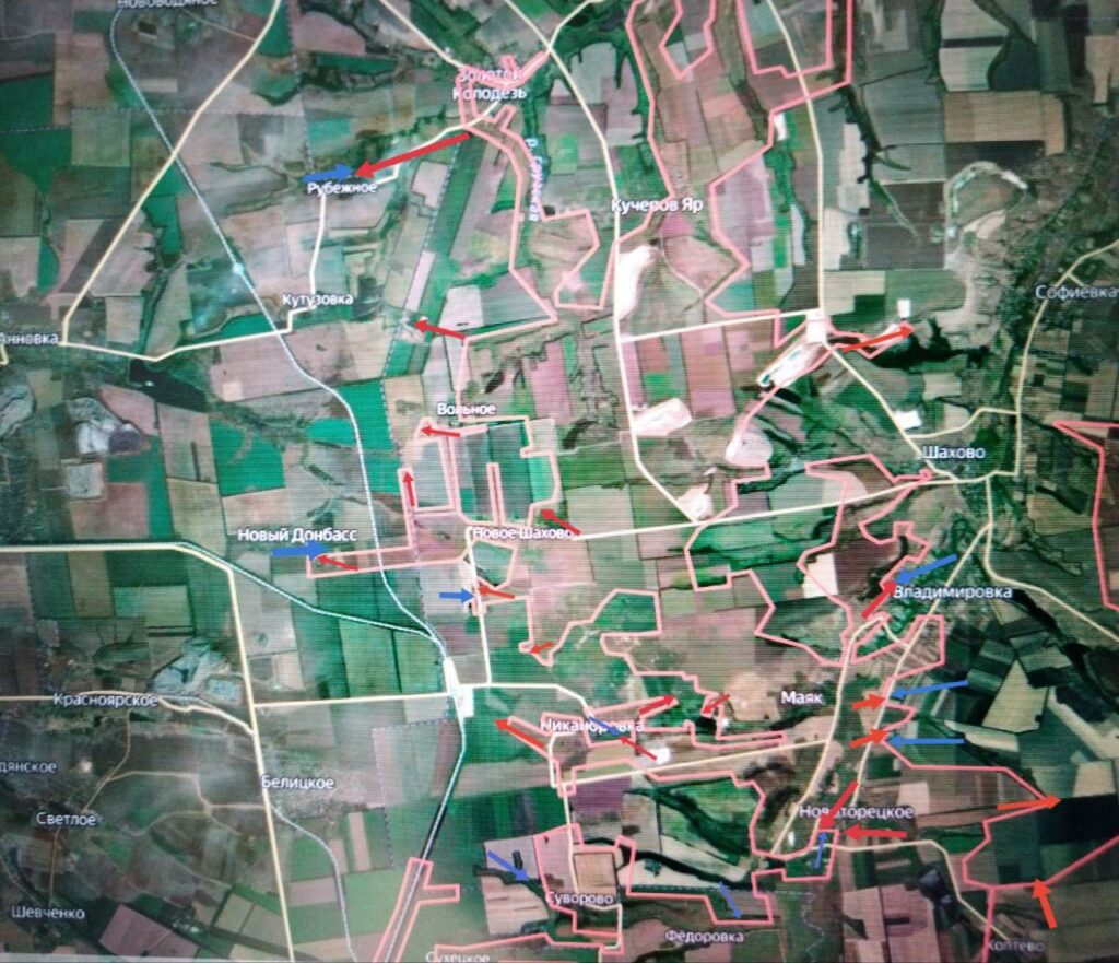 Севернее Розы Люксембург (Новое Шахово) выбили ВСУ из «зелёнки». Бои в Вольном, Новом Донбассе, Рубежном, Золотом Колодезе, в направлении Кутузовки. Северо-западнее Октябрьского (Шахово) ВС РФ продвинулись от карьера №2 в направлении юго-западной окраины Артёмовки (Софиевки) и заняли карьер № 3 и часть урочища.