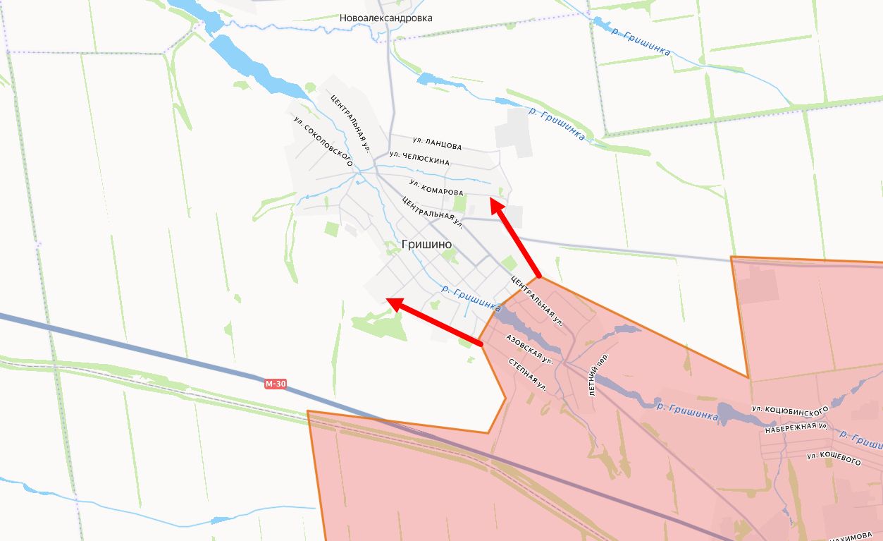 В районе Гришино зона контроля расширена севернее улицы Олимпийской. Под контроль перешли новые участки застройки и прилегающие территории к западу от населённого пункта, что усилило общее давление на этом направлении.