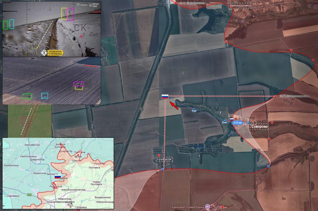 На Красноармейском направлении фиксировалась атакующая активность западнее Суворово и в жилой застройке южной части Родинского. Одновременно штурмовые подразделения ВС РФ достигли Цветкового и зашли в северную часть Зализничного, продолжая атаки в районе Доброполья. Зона контроля была расширена по рубежу Гуляйполе — Дорожнянка.