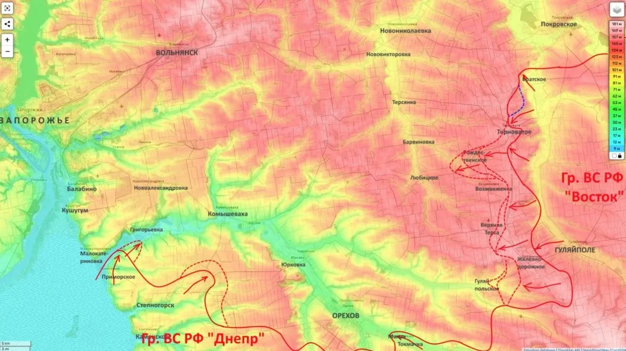 Но речь, судя по описанию, не о быстром прорыве. Бои здесь тяжёлые, вязкие, с постоянной работой по лесополосам и укреплённым опорным пунктам. На северном фасе, как уточняется в сводке, украинские силы пытаются контратаковать по схеме прошлогодней кампании, стараясь срезать образовавшиеся выступы. Южнее, напротив, 5-я и 35-я армии ВС РФ удерживают давление.
